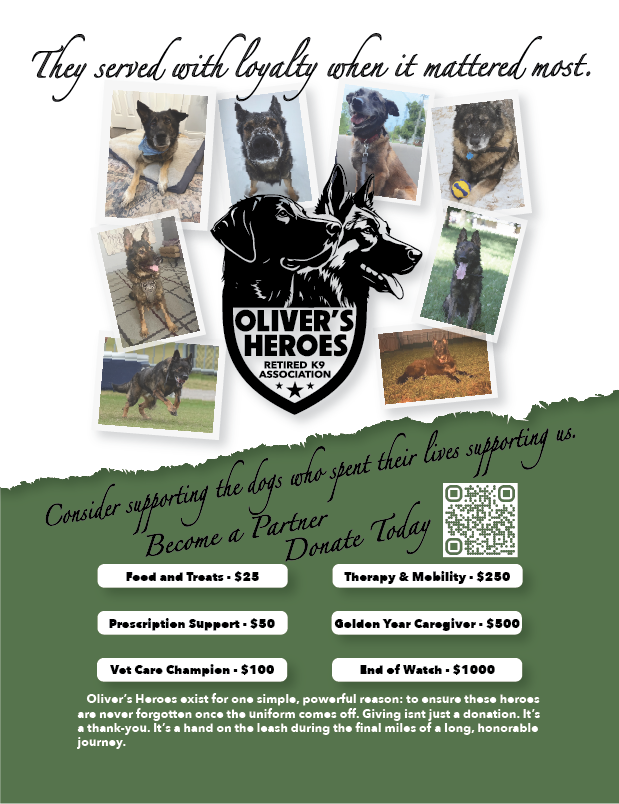 Every retired working canine carries a lifetime of dedication in their paws. Years spent protecting communities, assisting handlers, and giving everything they had without question. When their service ends, their needs don’t. Age brings medical care, special diets, medications, therapy, and eventually compassionate end-of-life support.Oliver's Heroes exists for one simple, powerful reason: to ensure these heroes are never forgotten once the uniform comes off.Your donation directly covers the essentials that keep retired canines comfortable and cared for. All dietary needs covered at no cost to the handler. Routine and emergency veterinary visits. Prescription medications. Physical therapy to ease aging joints. Gentle, dignified end-of-life care when the time comes.And here’s the promise that sets this organization apart: 100% of every donation goes straight to the care of retired canines. No salaries. No overhead games. Just real help for dogs who spent their lives helping us.Giving isn’t just a donation. It’s a thank-you. It’s a hand on the leash during the final miles of a long, honorable journey. Support the dogs who spent their lives supporting us.